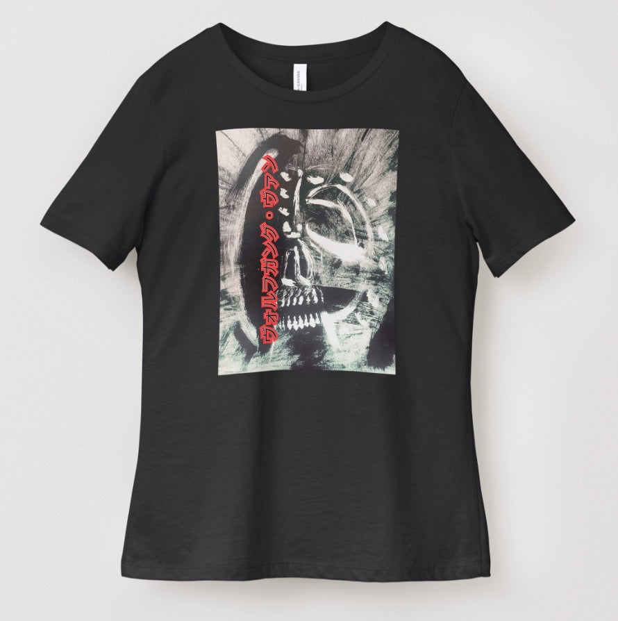 Striking & unique black t-shirt featuring artistic Japanese Kanji that spells out "Wolfgang Vann", over Zulu mask design with bold artistic red text. This unique piece combines cultural artistry with Japanese aesthetics and contemporary streetwear style, perfect for making a bold statement. For art & music enthusiasts...