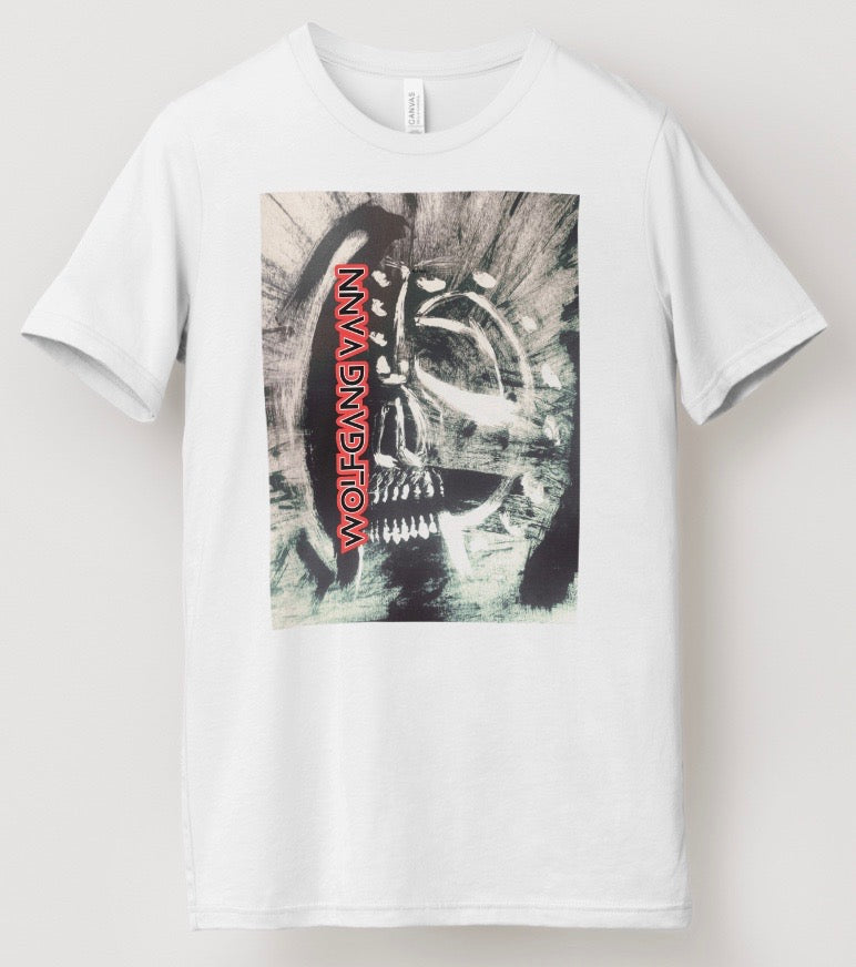 Bold white t-shirt featuring the striking Zulu Mask design with dramatic red Wolfgang Vann text. This powerful artistic piece combines cultural imagery with contemporary style, perfect for making a statement.